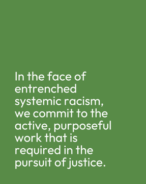 We stand committed to regularly reviewing and refining our practices, continually seeking opportunities for progress and improved equity. In the face of entrenched systemic racism, we commit to the active, purposeful work that is required in the pursuit of justice.